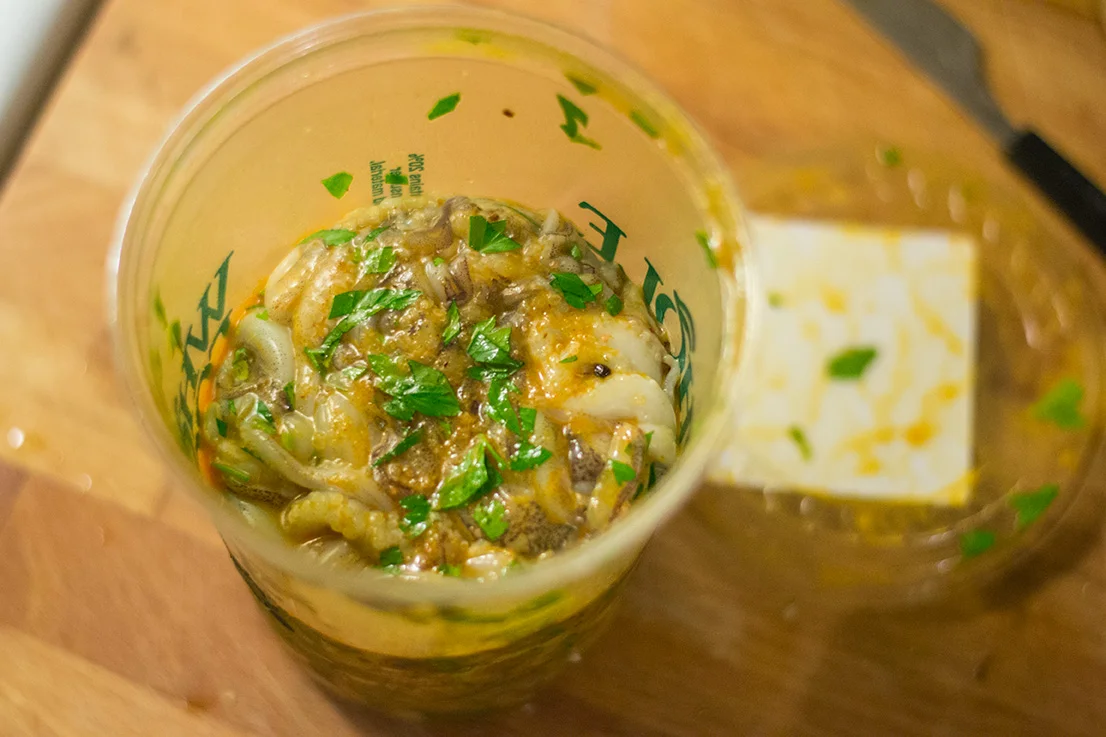In a Ziploc bag put all the ingredients from the marinade list and give it a good shake. I used the same container I got the Squid in. Let it do it's thing for 15 minutes.