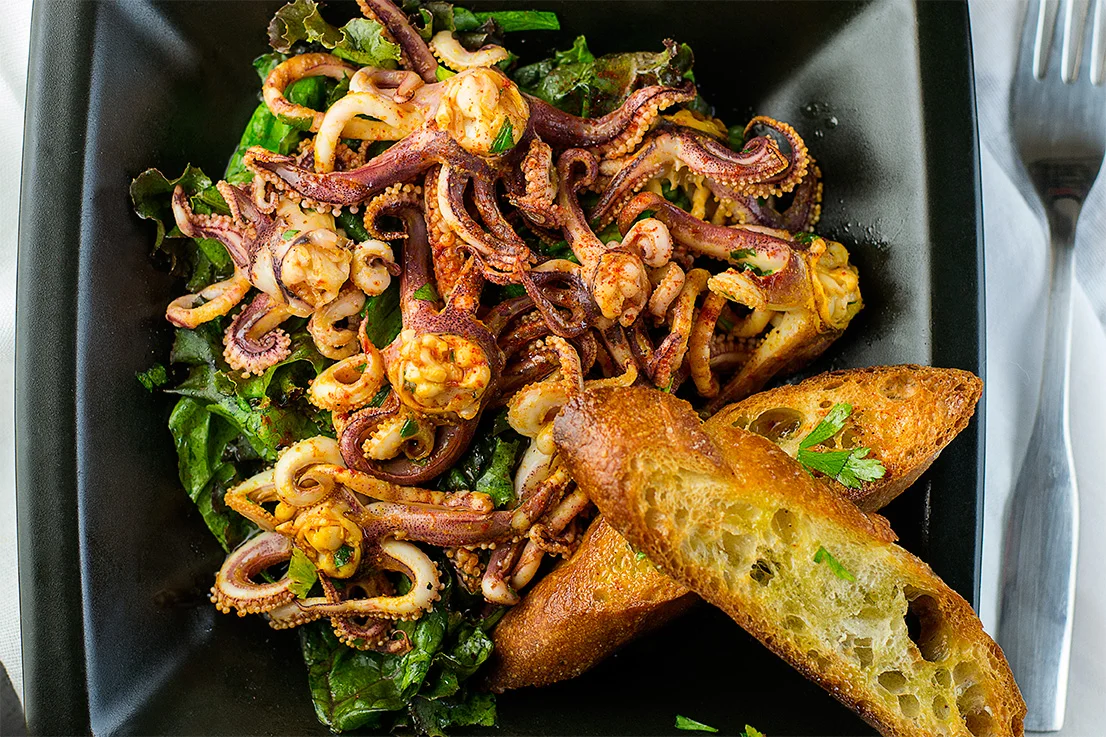 It turned out amazing. The squid was smokey and citrusy and so tender! It went perfect with some lettuce and crisp baked Crostini, all making for a perfect bite of a summery, healthy salad.